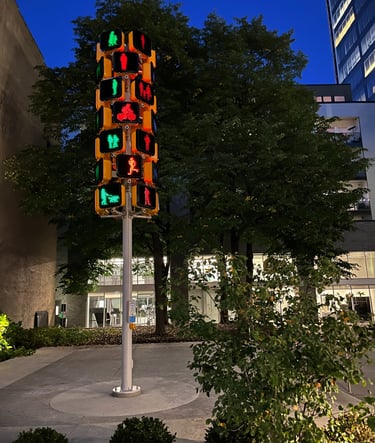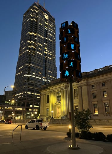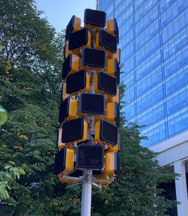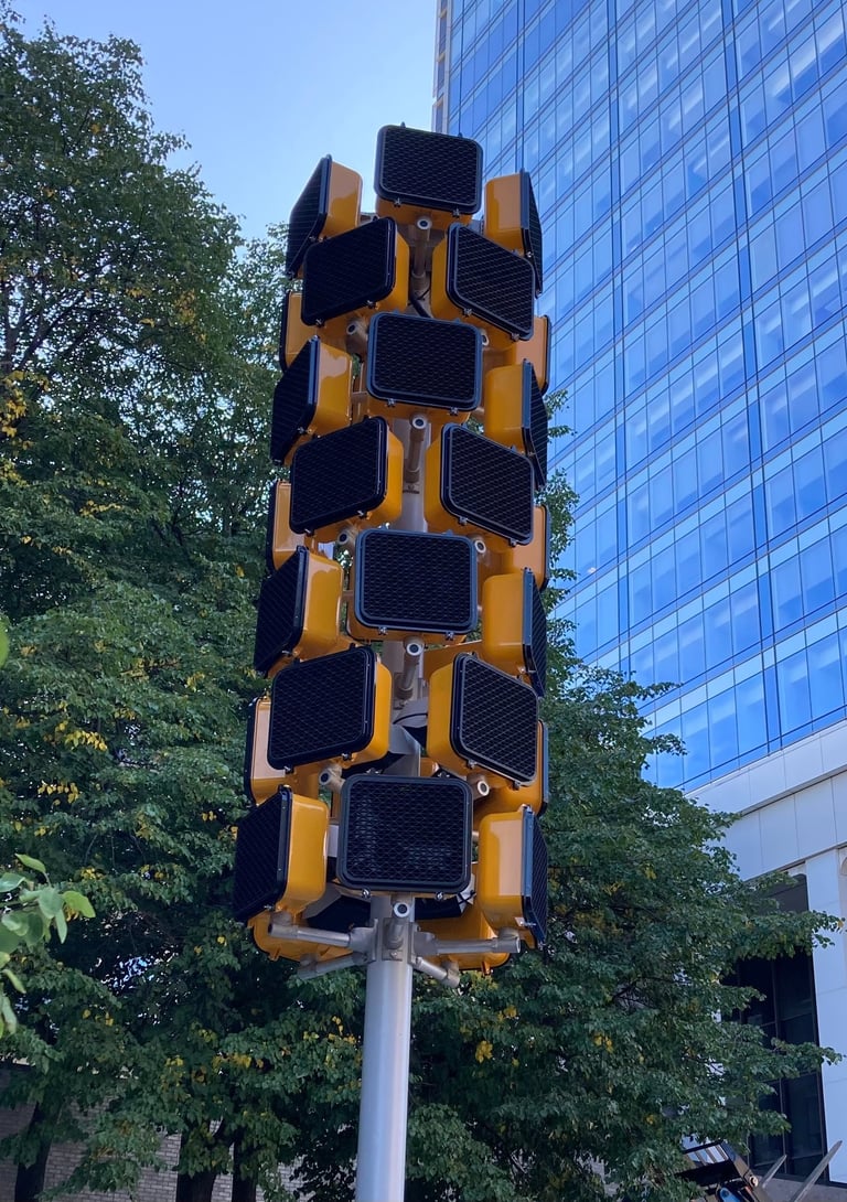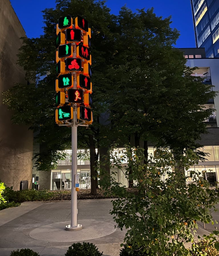 Signal is a 21 foot sculpture with interactive audio and lighting elements. The piece is installed in the Ardmore Apartment entrance on 231 N. Pennsylvania St, Indianapolis. Signal offers pedestrians an interactive experience that playfully amplifies the simple act of using a crosswalk or occupying the street space. A button triggers a short generative audio and light sequence that is different with each experience.